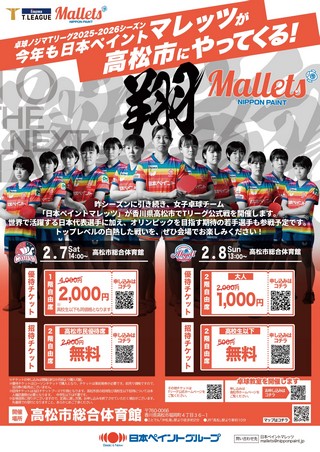 2026年2月7日・8日に行われる,Tリーグ・日本ペイントマレッツのポスターです。